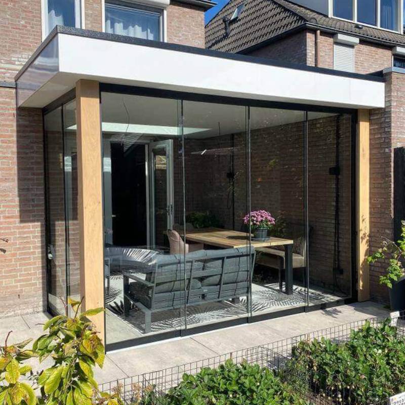 Het plaatsen van deze veranda: houtwerk, dakbekleding en glazen panelen